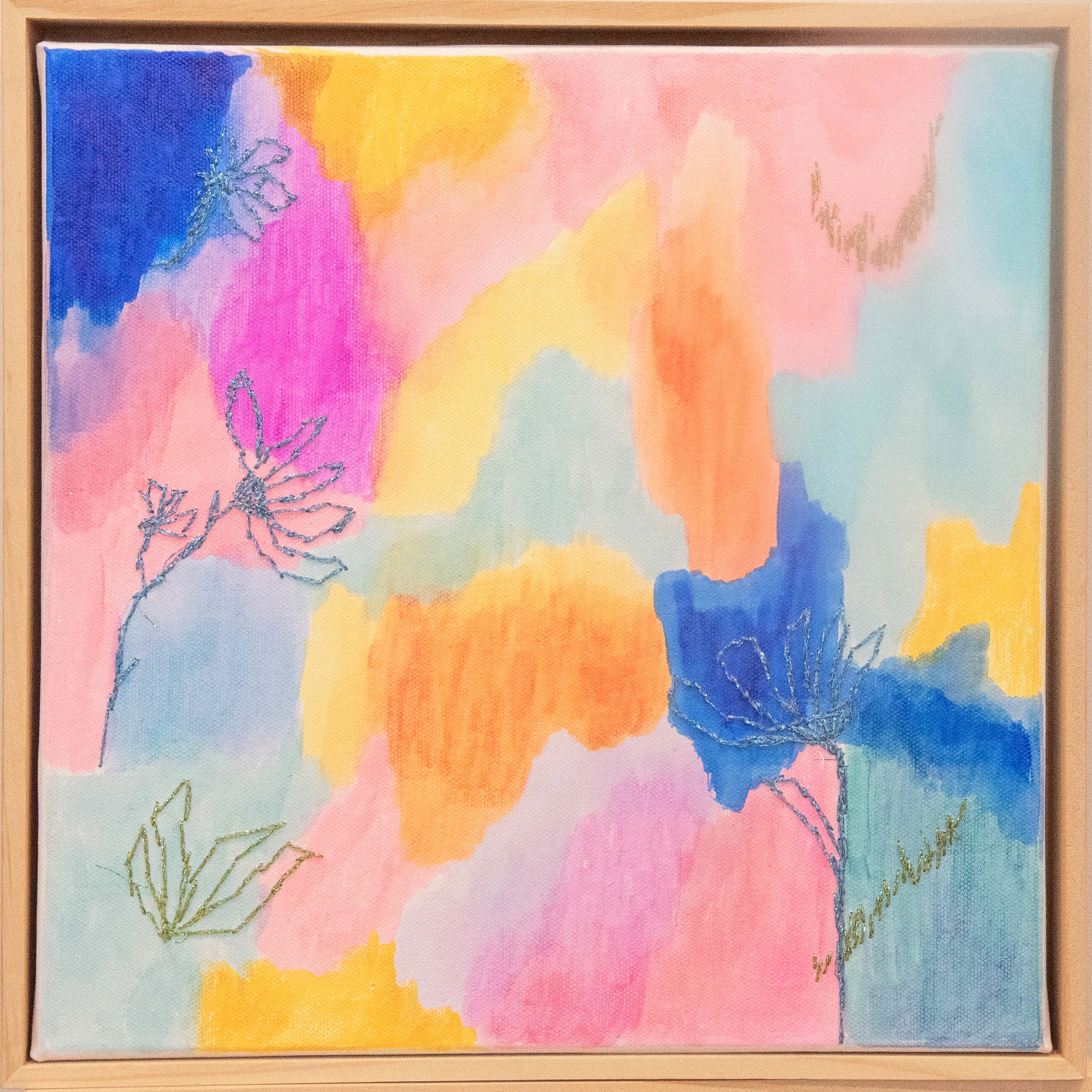 Embroidery thread, wool, sequins and alcohol ink on canvas, framed